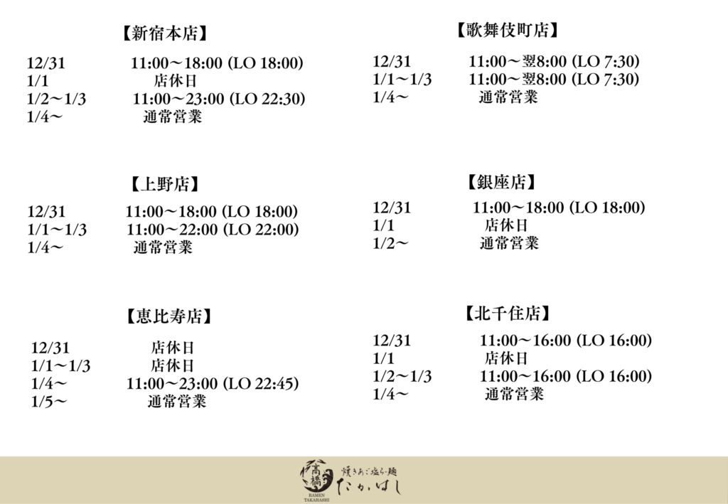 年末年始の営業時間 投稿日 2025年12月28日 著者 焼きあご塩らー麺たかはし カテゴリー お知らせ いつも焼きあご塩らー麺たかはしをご利用いただき誠にありがとうございます。 年末年始の各店舗の営業時間をお知らせします。 皆様のご来店お待ちしております。